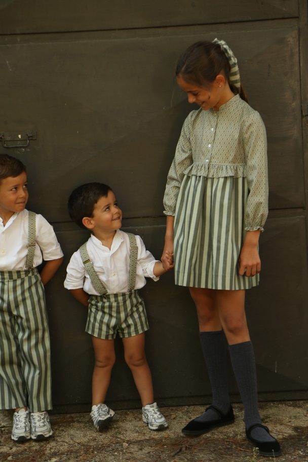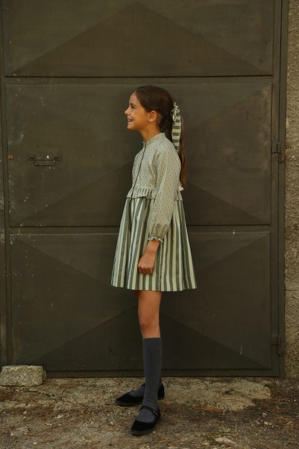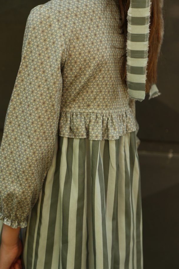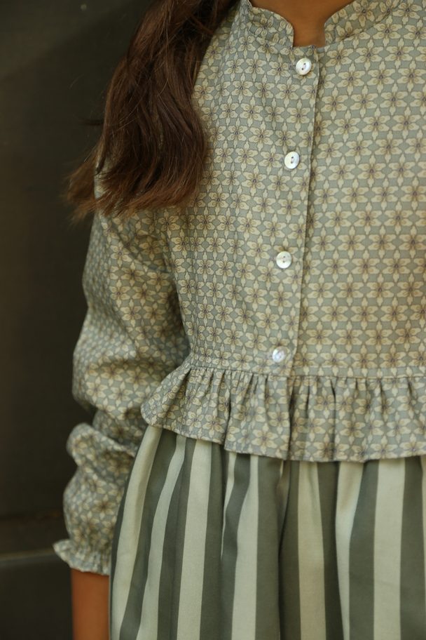 Vestido confeccionado en dos tejidos. Parte superior abotonada, manga larga con goma y cuello mao.