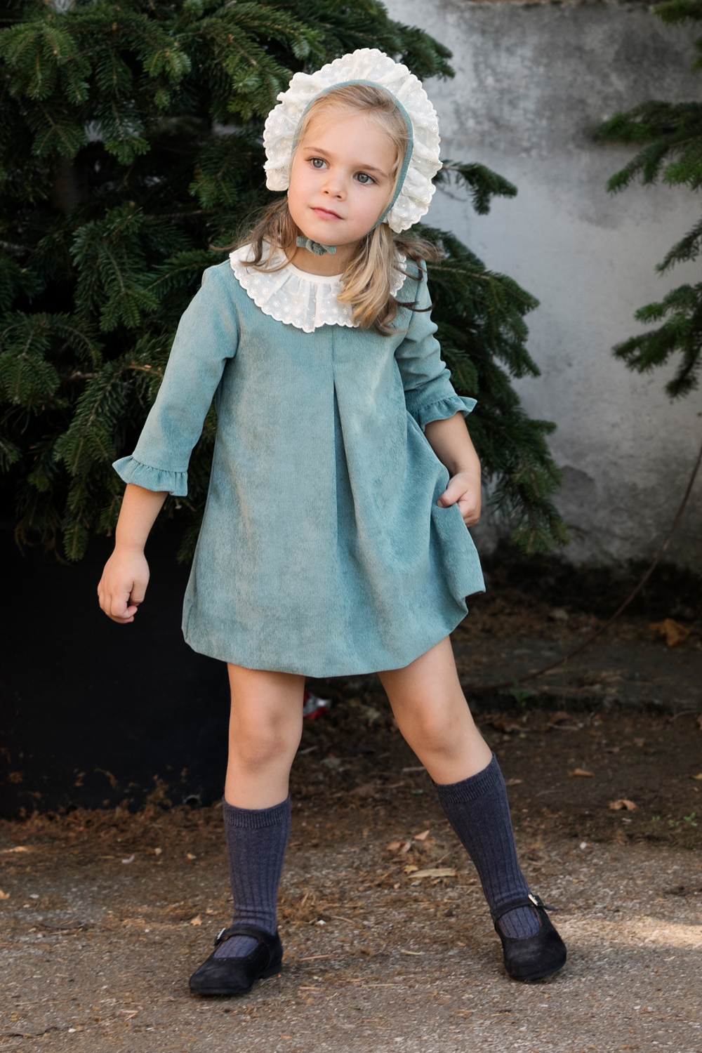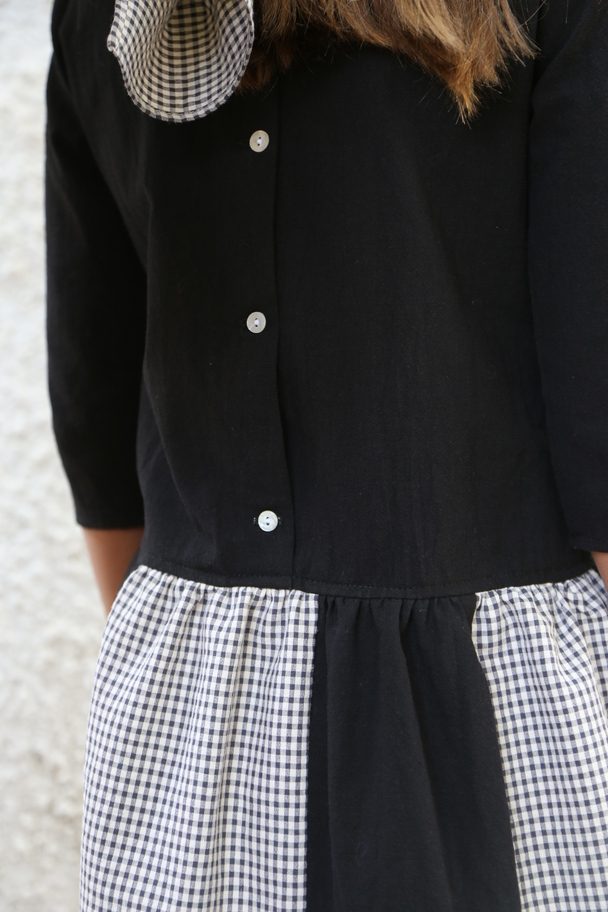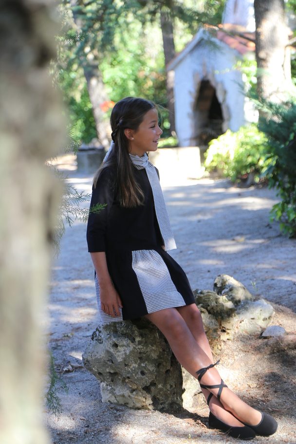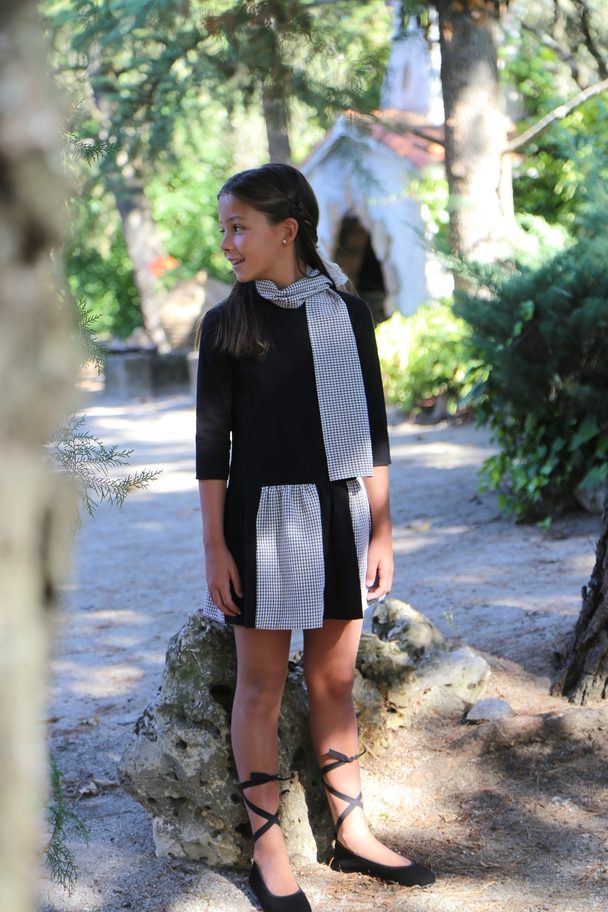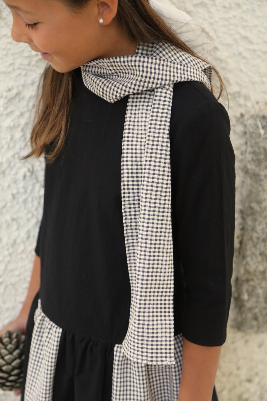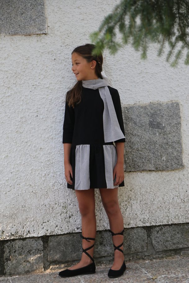 Vestido con corte charleston, la falda está hecha en dos tejidos. La bufanda de tela va aparte. No incluída en el vestido.