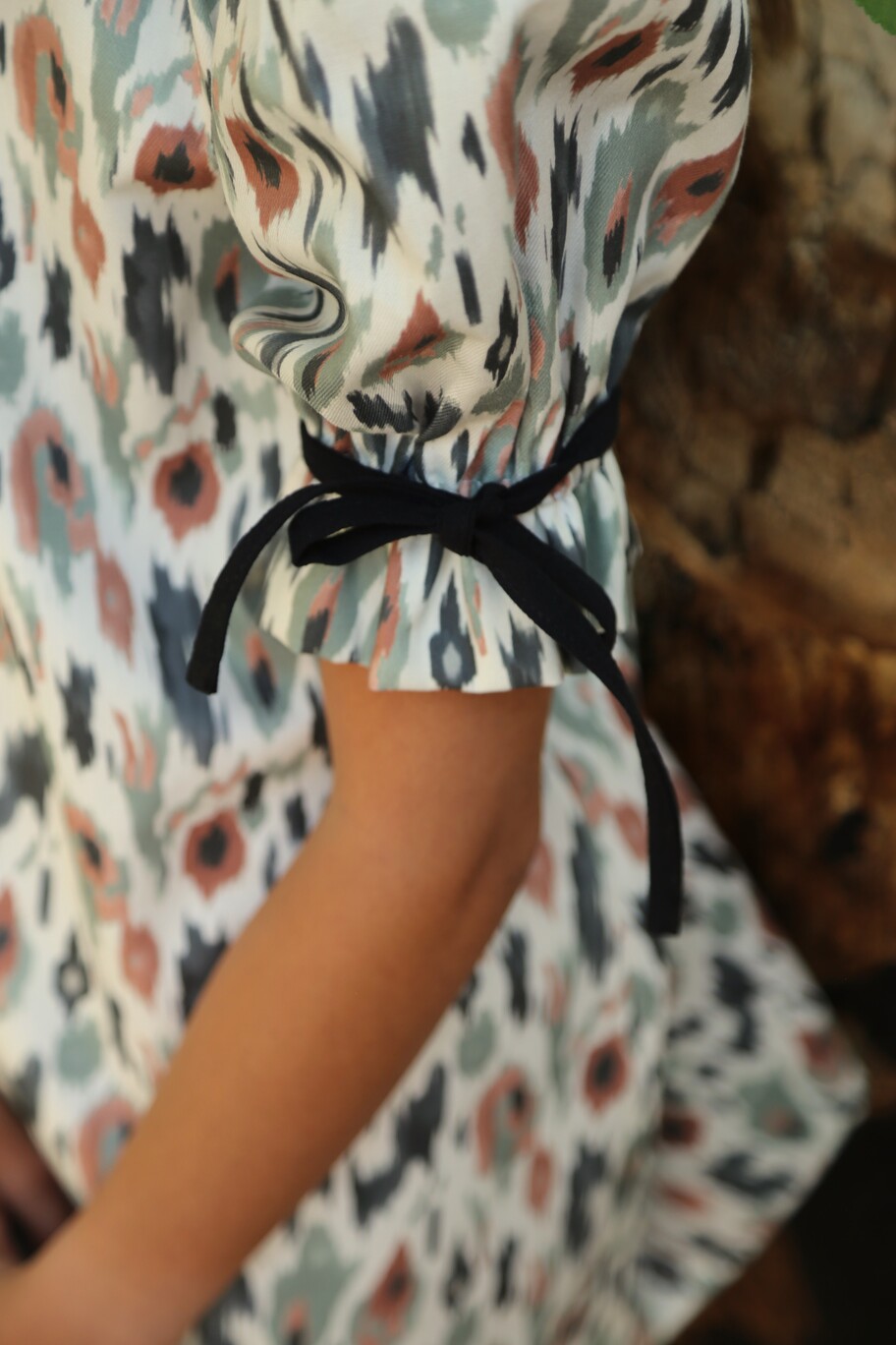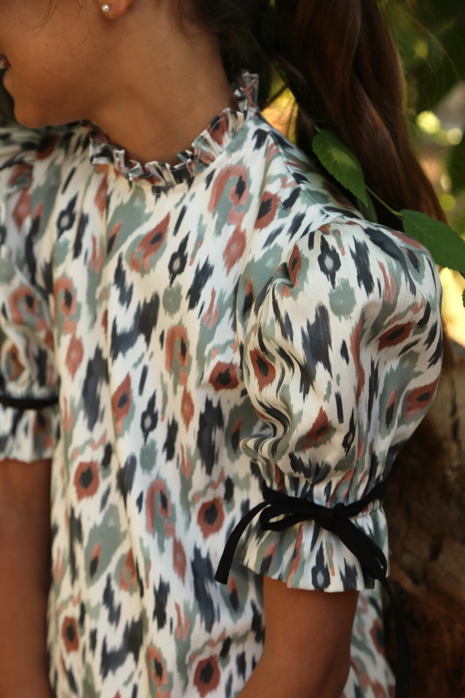Vestido de corte evasé, manga abullonada con hombrera interna, cuello sencillo hacia arriba y lacitos opcionales en las mangas.