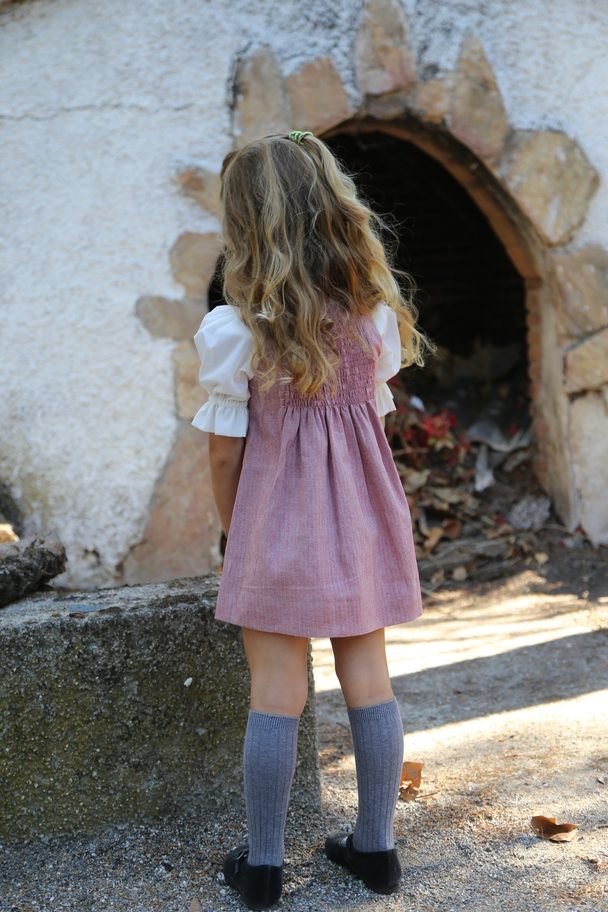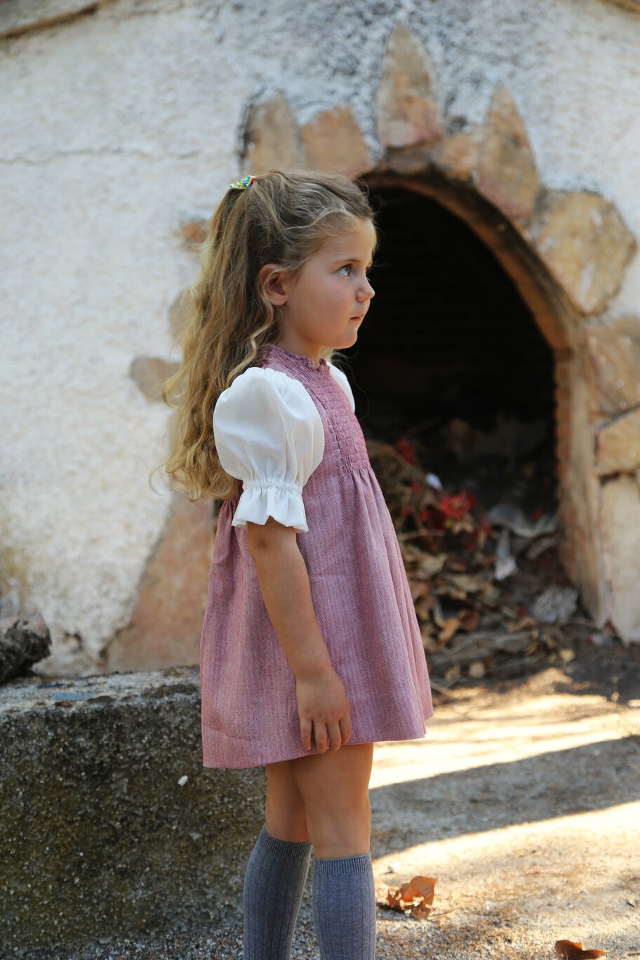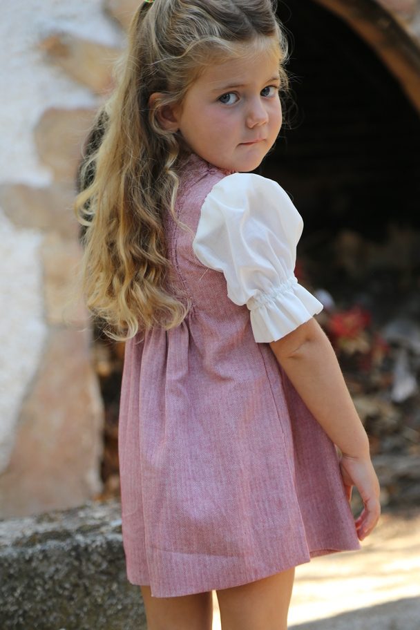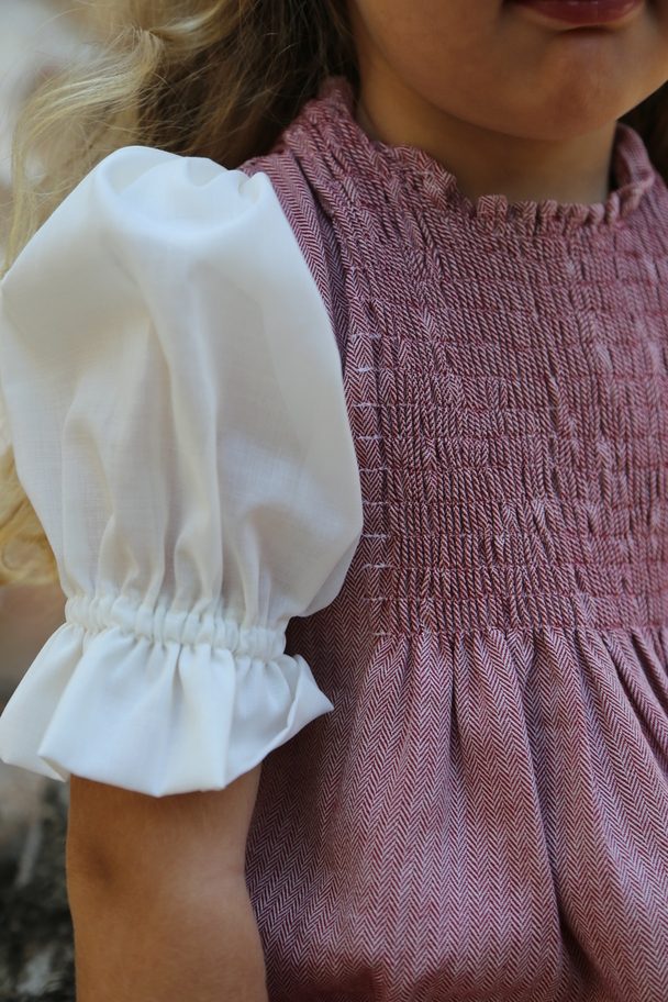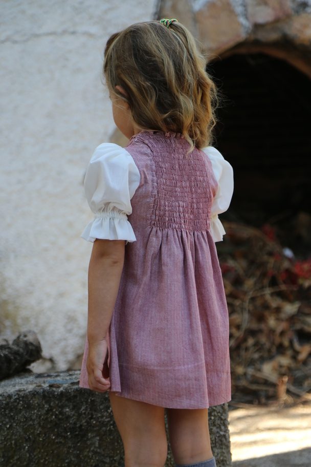 Vestido icónico de Ussía, con el frunce delantero y trasero tan cómodo, y manga de batista abullonada y con hombrera.